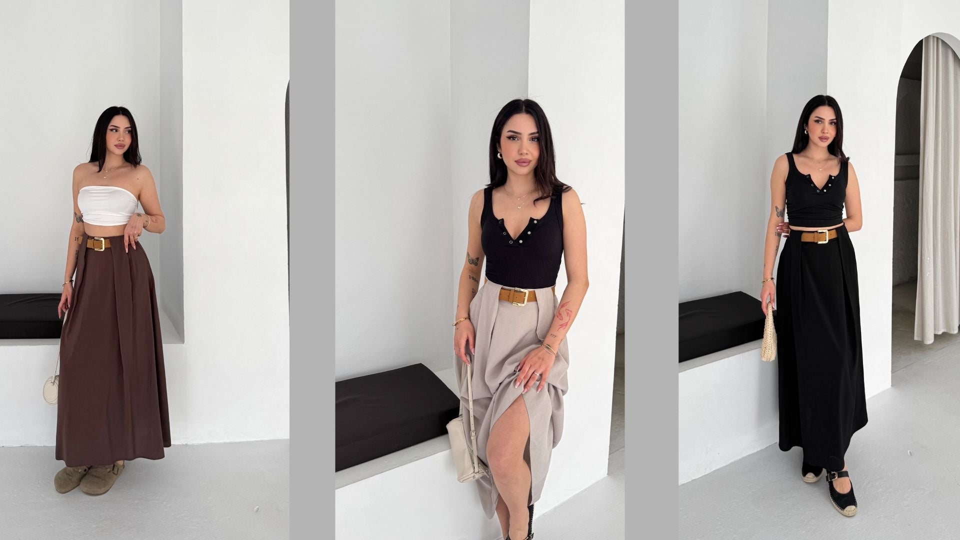 Kadın Modal Dokuma Kemer Detaylı Rahat Kalıp Etek Bej